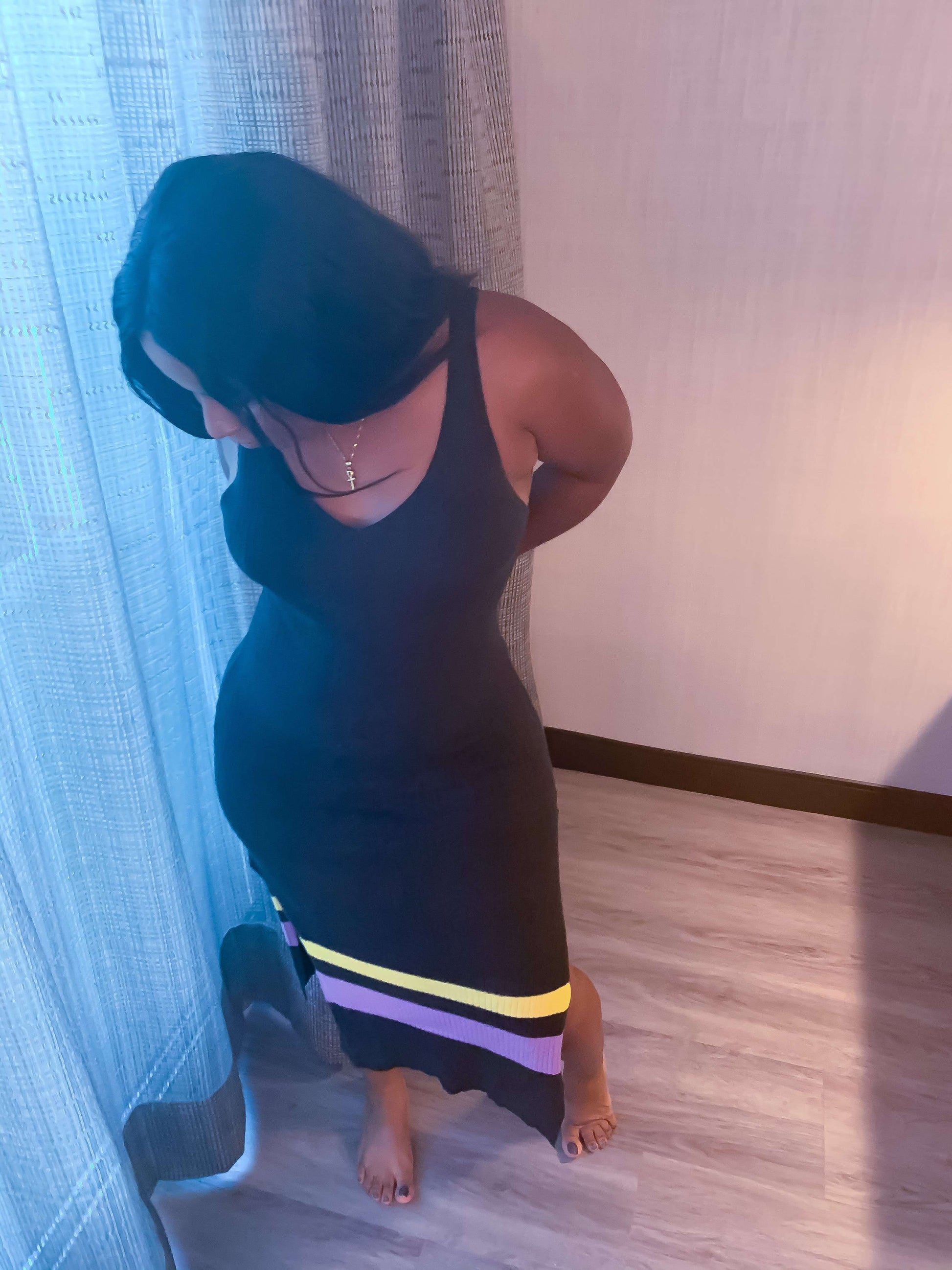 A soft knit midi dress with a color block design.