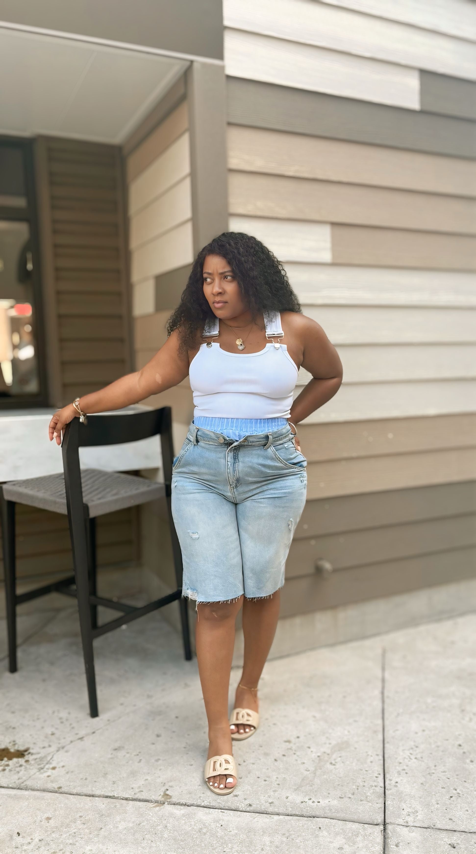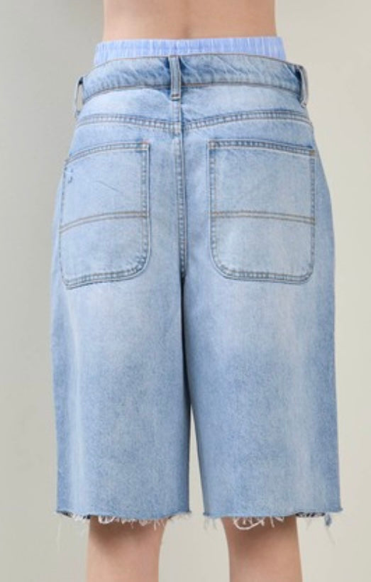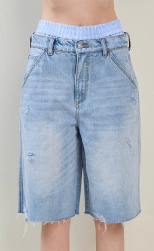 These denim Bermuda shorts offer a modern twist with an attached boxer waist, providing both comfort and style.